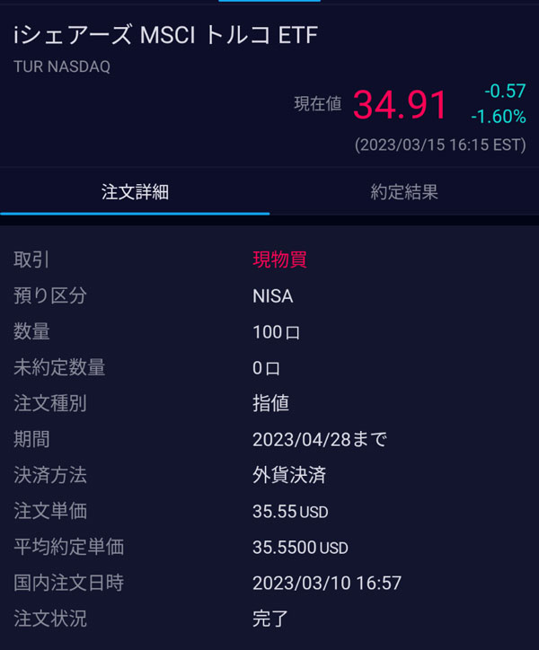 2023年3月14日(火)、SBI証券で指値注文してたiシェアーズ MSCI トルコ ETF(TUR)が刺さった!