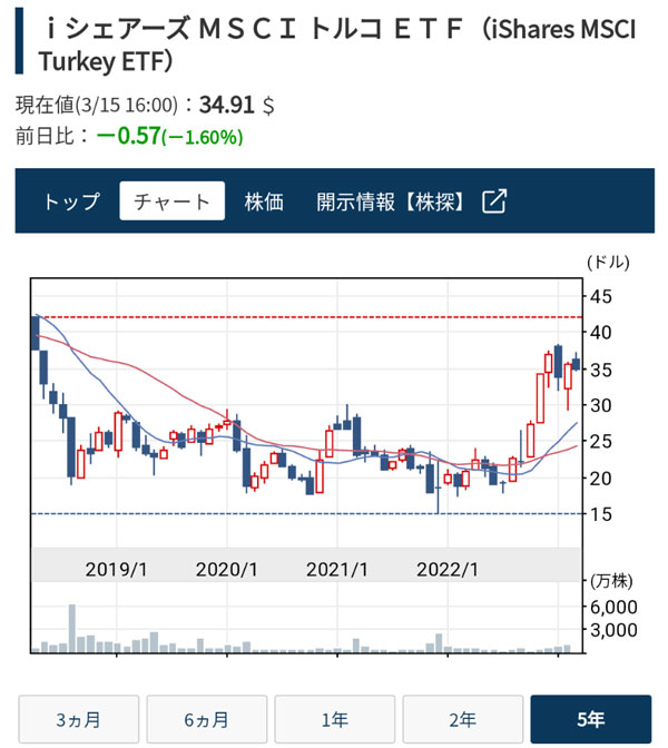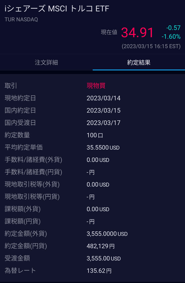 2023年3月14日(火)、2023年の一般NISA枠でiシェアーズ MSCI トルコ ETF(TUR)を100株(3,555ドル)買いました(+50株買い増して150株保有)!
