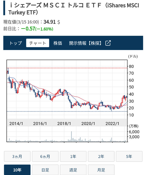 10年後、2033年のiシェアーズ MSCI トルコ ETF(TUR)の株価は100ドル(約3倍)は期待したい!
