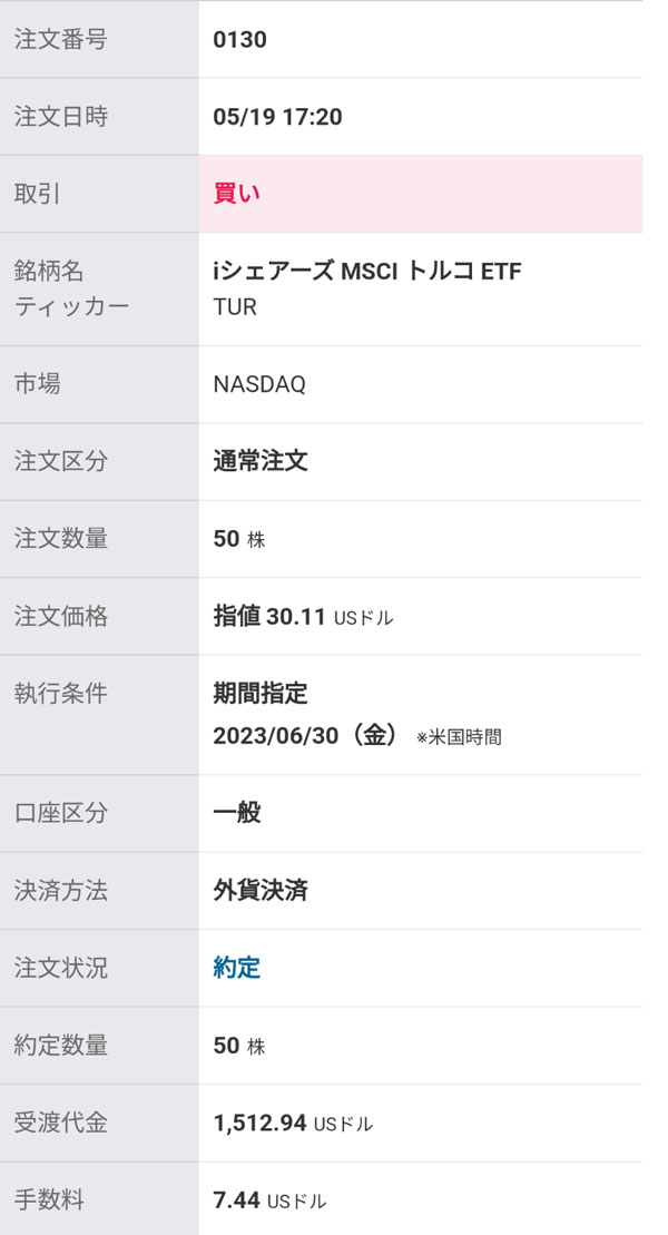 2023年6月7日(水)、楽天証券法人口座で50株指値注文してたiシェアーズ MSCI トルコ ETF(TUR)が約定して150株保有になりました。